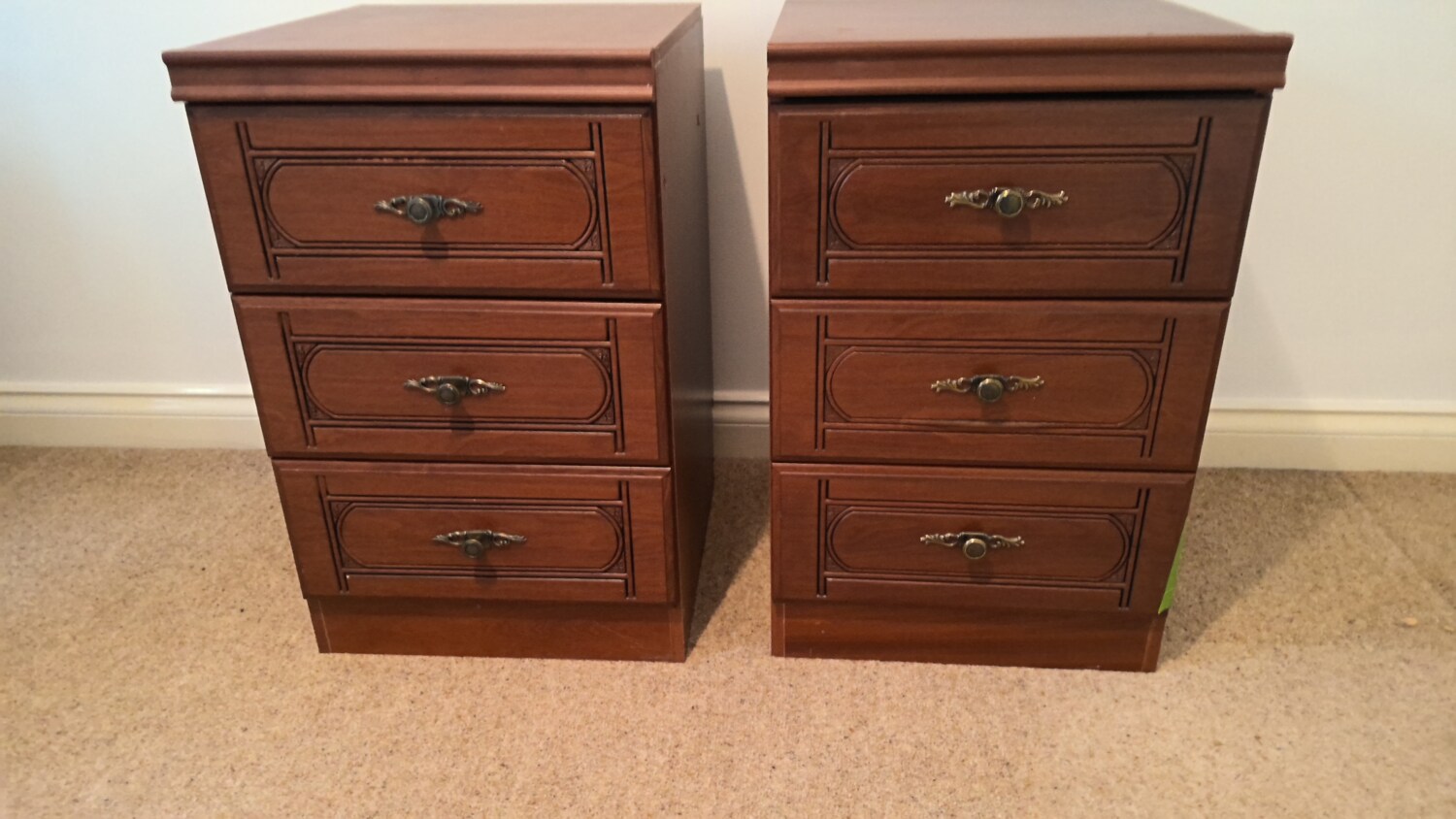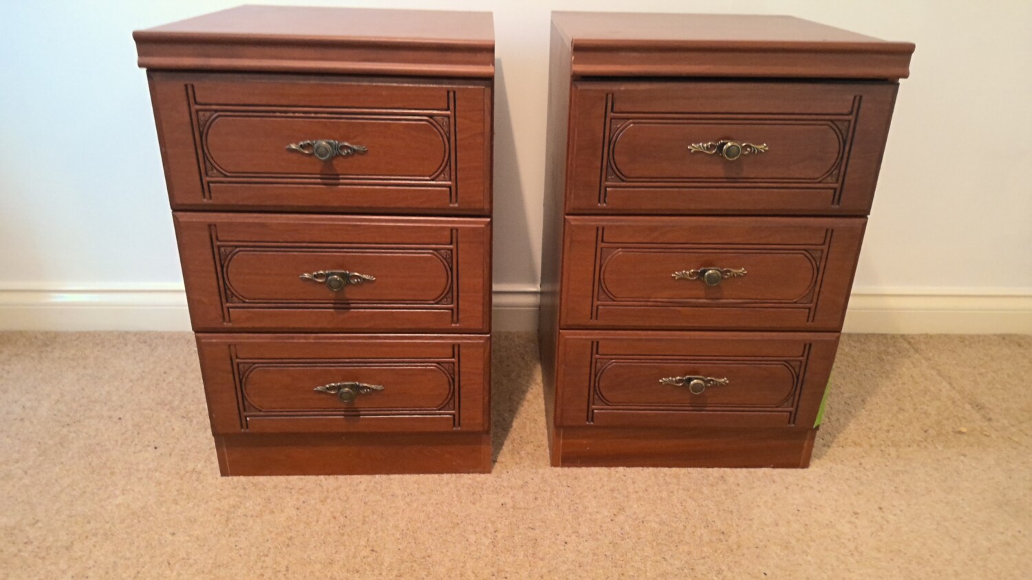 A matching pair of bedside cabinets with 3 drawers in each on finished in brown good solid cabinets