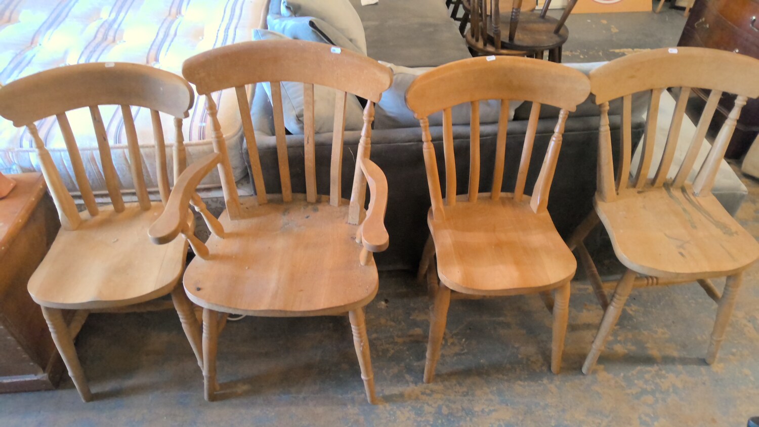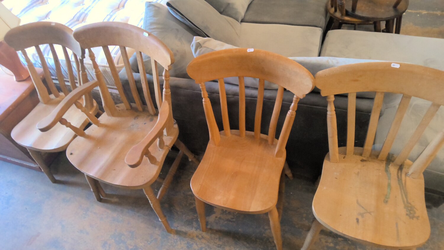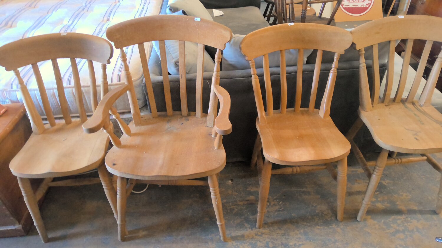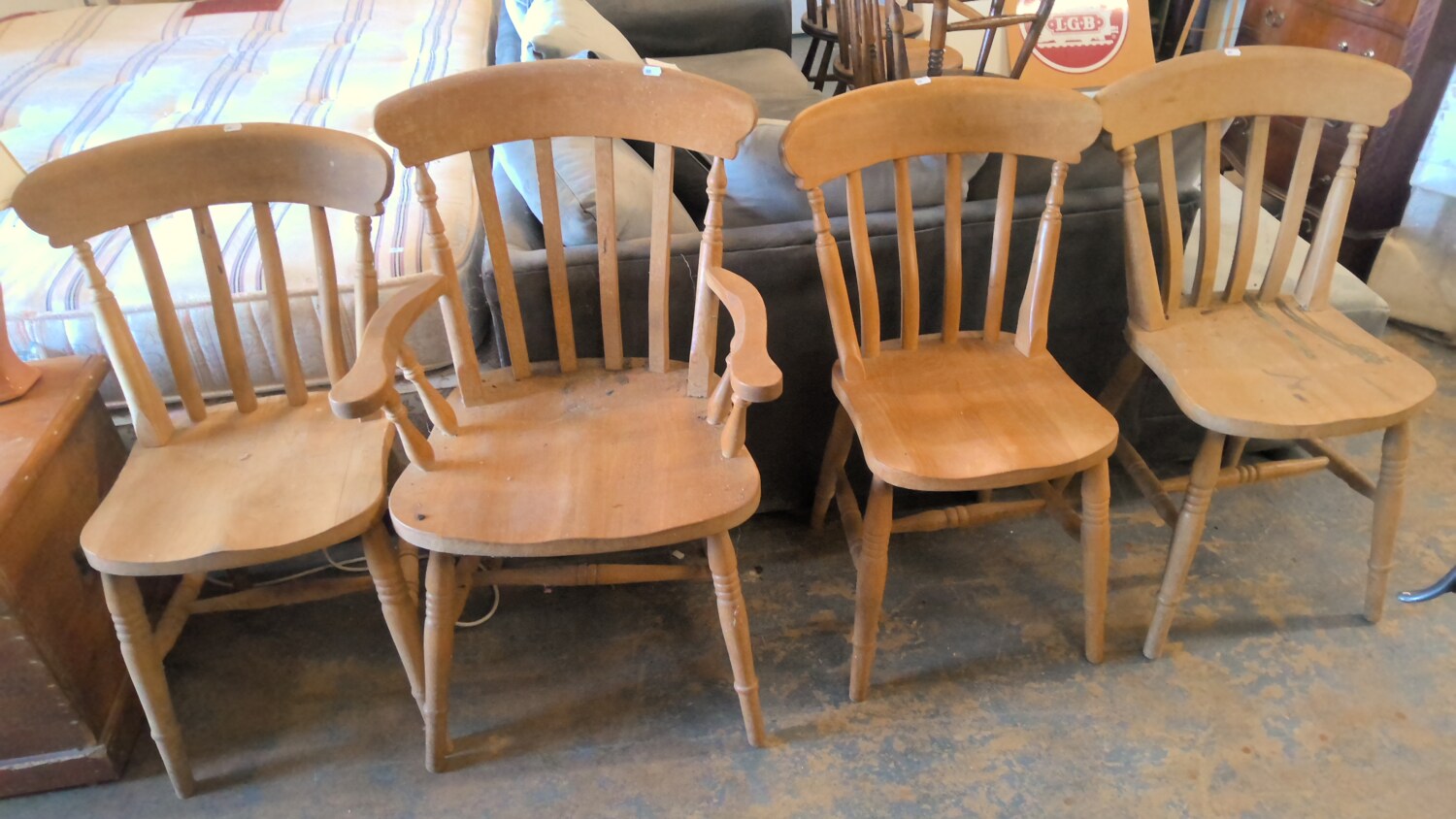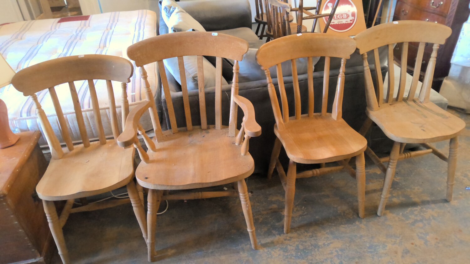 antique beechwood farm house chairs set of 4 only 1 carver chair in the set chairs need a clean or polish but very good sturdy chairs