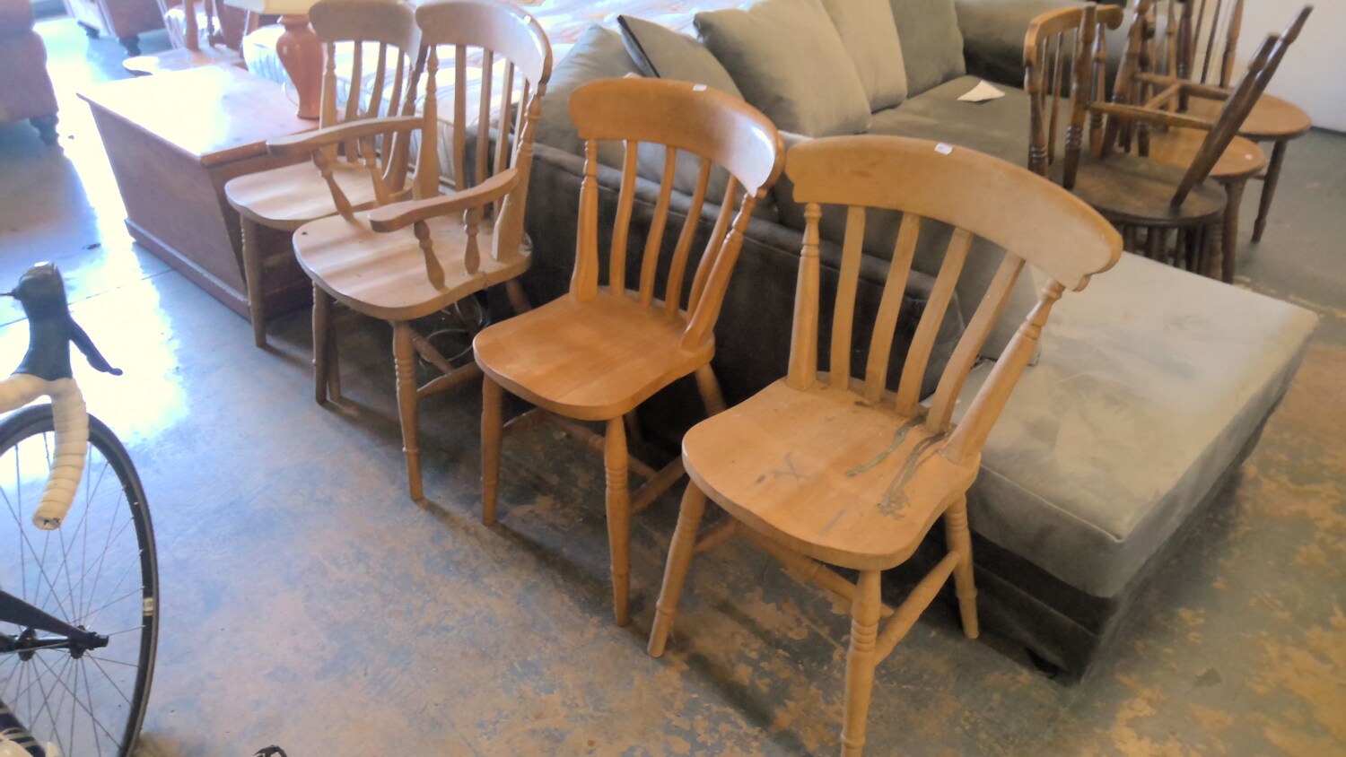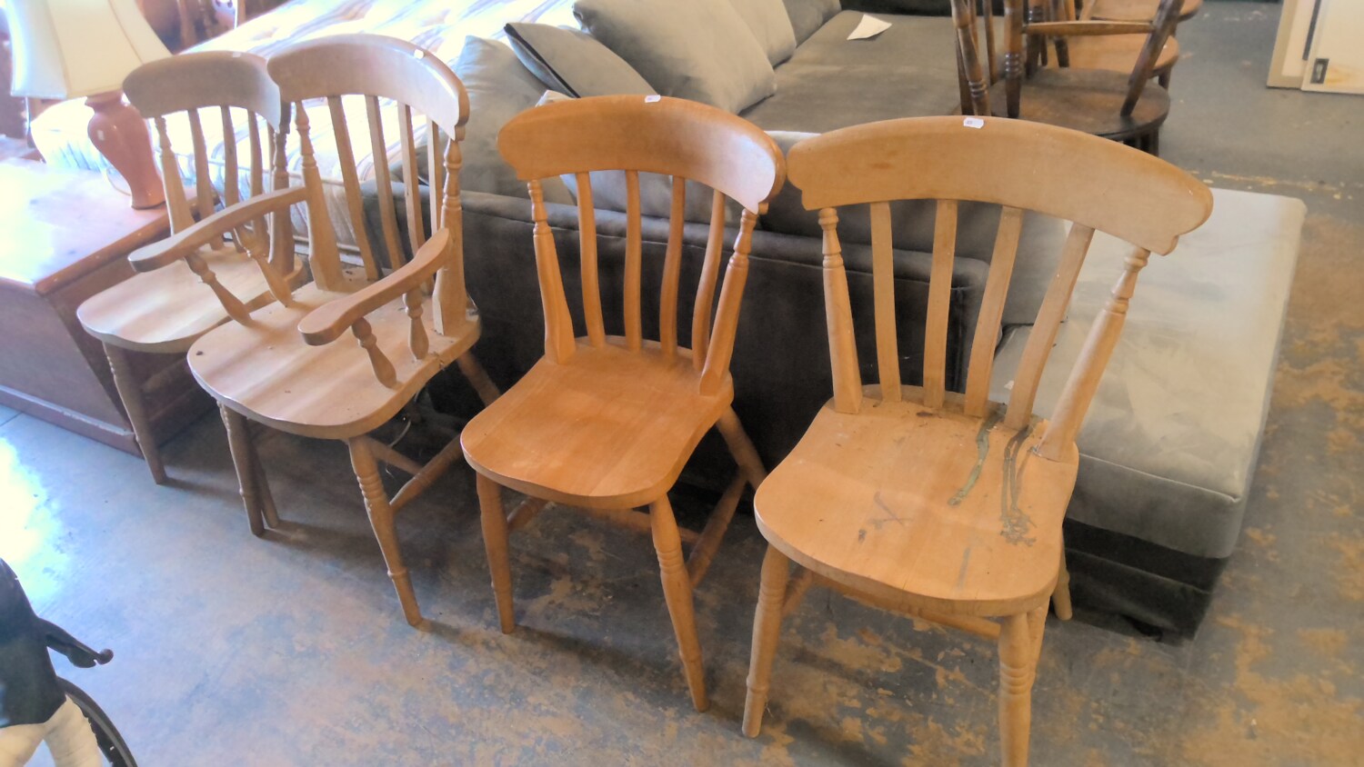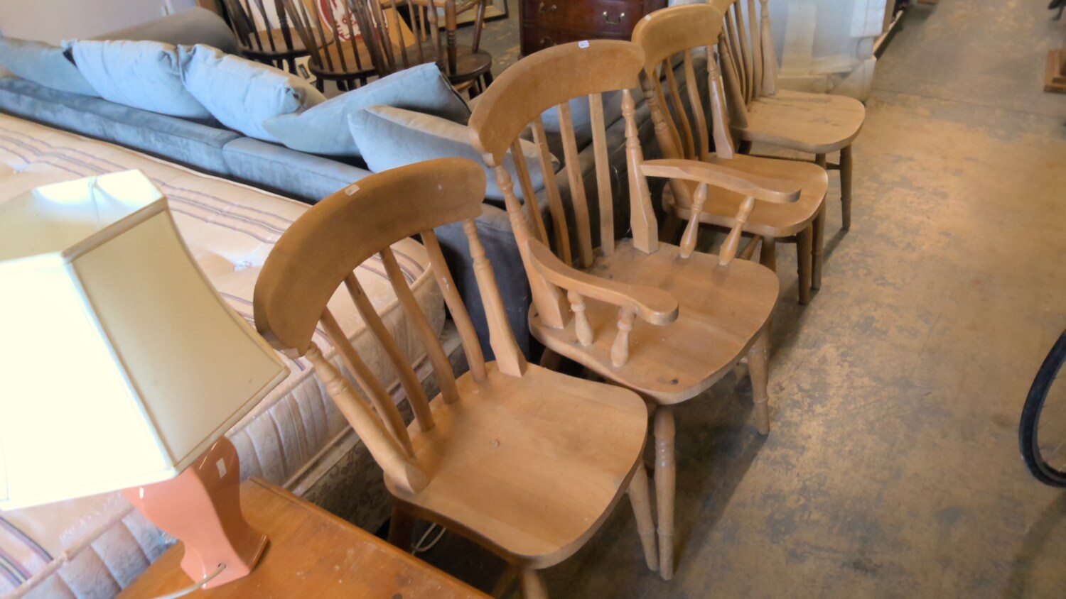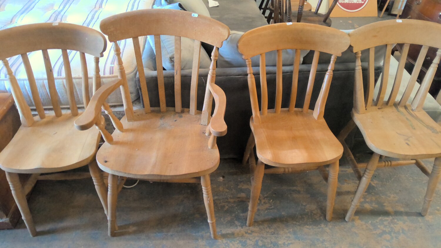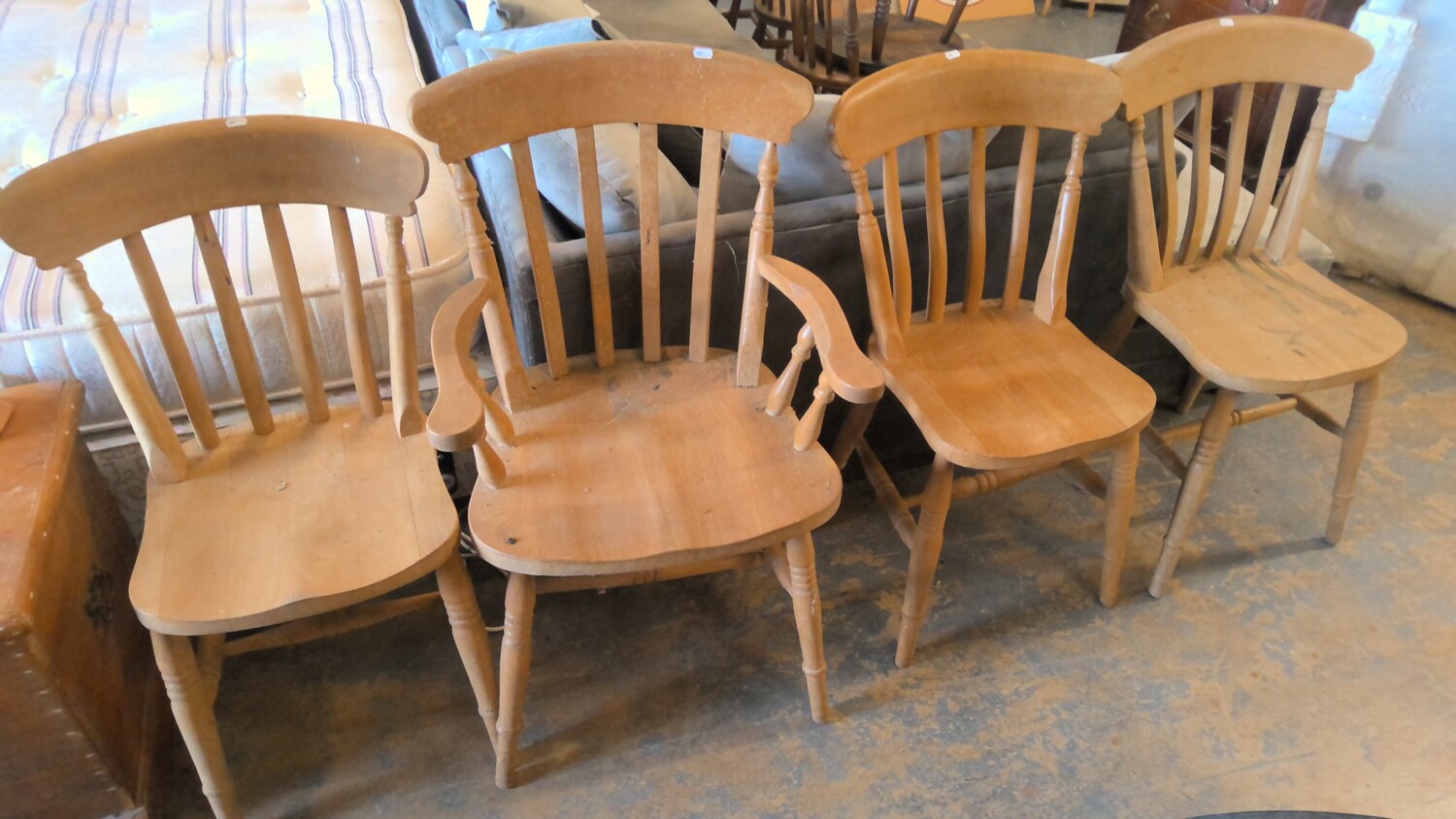 antique beechwood farm house chairs set of 4 only 1 carver chair in the set chairs need a clean or polish but very good sturdy chairs