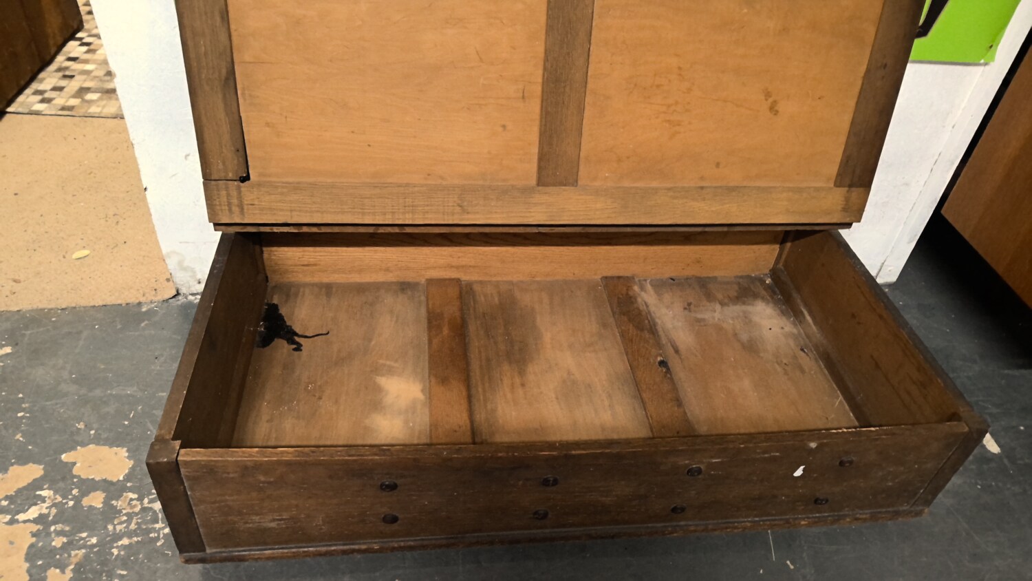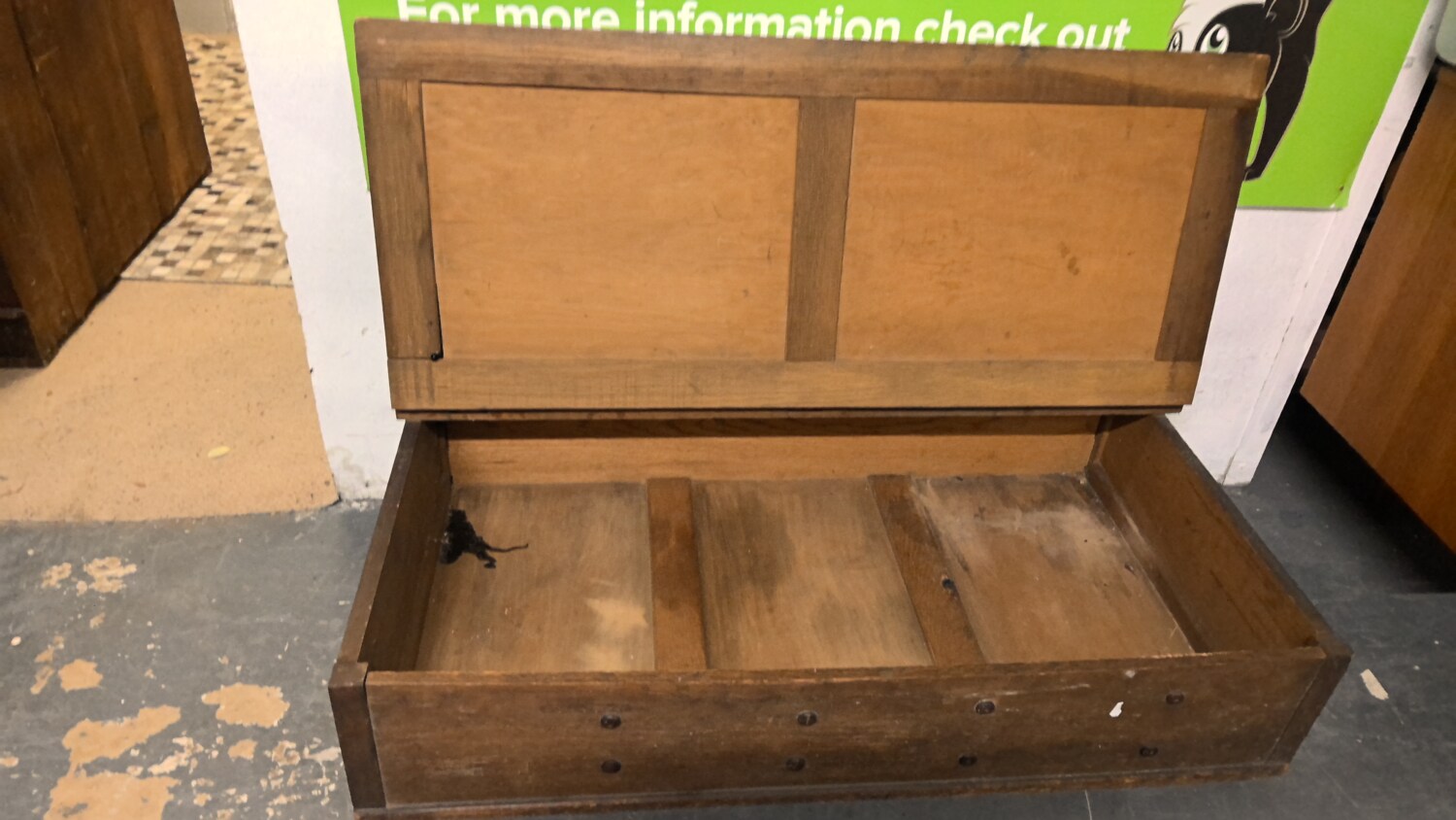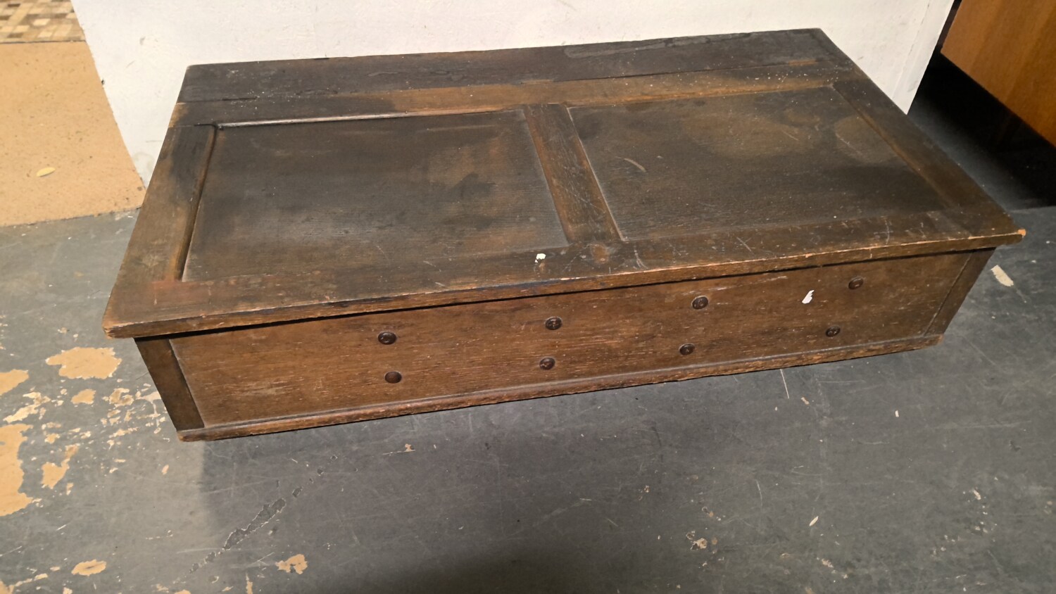 antique wood mule chest / blanket box with a hinged lid and caster wheels this chest is 118cm long / depth 62cm height 29cm /
