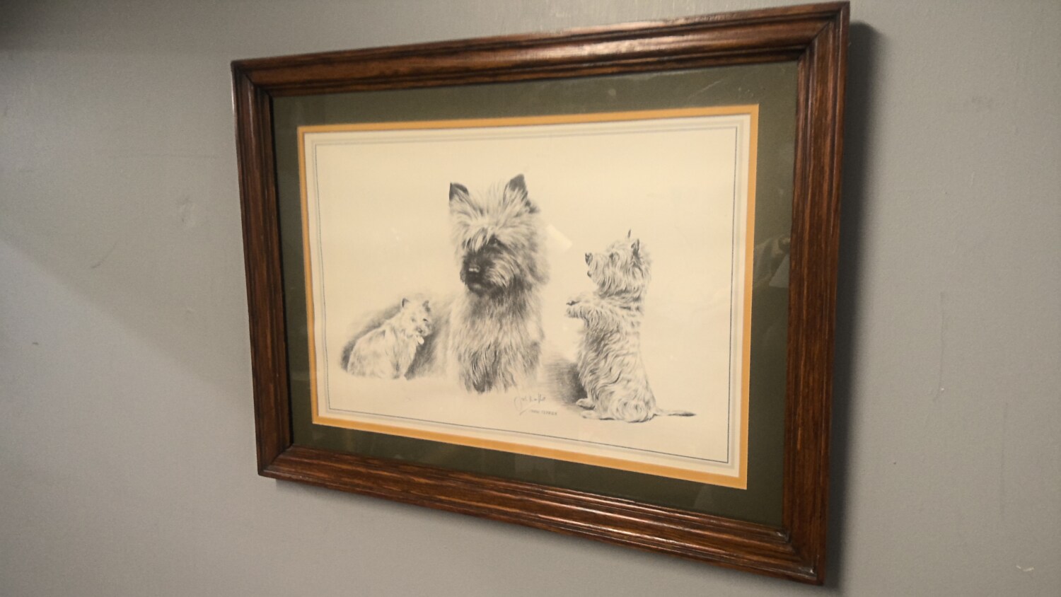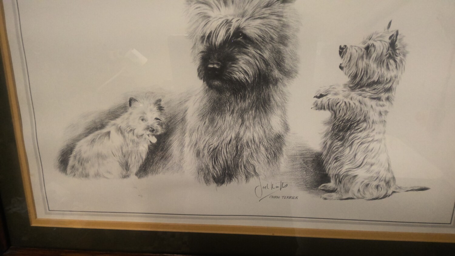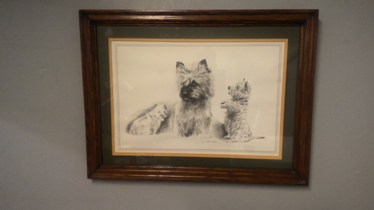 large print of a Cairn Terrier by artist Joel Kimble is a single-piece item made of paper, in a brown frame measuring 47cm in height, 62cm in length, and 3cm in width. The United Kingdom-based artwork features cairn terriers as its subject, showcasing the theme of animals with a charming and lifelike depiction of the beloved breed. Ideal for animal lovers and art enthusiasts alike, this print captures the essence of the Cairn Terrier in a beautiful and detailed illustration.