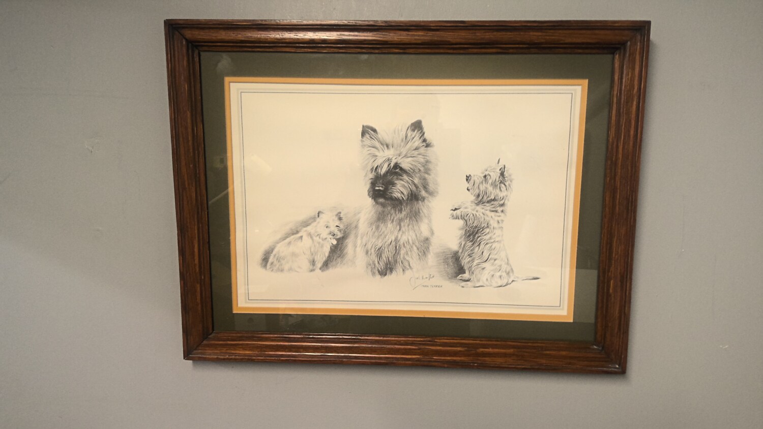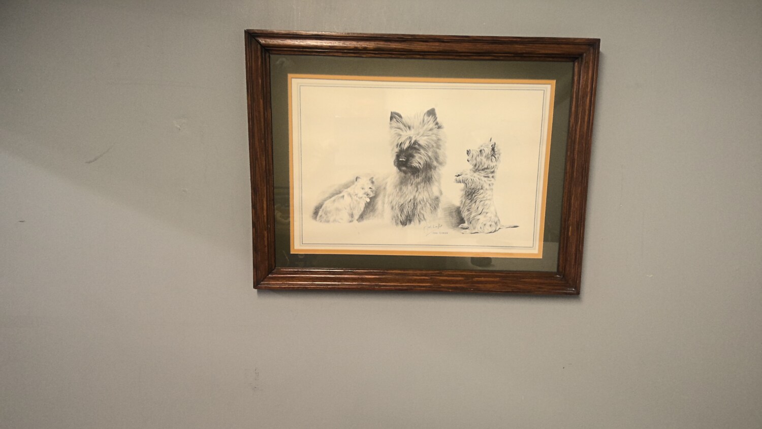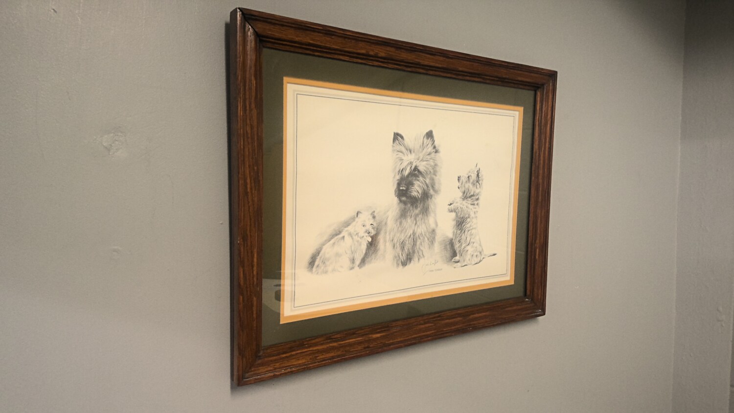 large print of a Cairn Terrier by artist Joel Kimble is a single-piece item made of paper, in a brown frame measuring 47cm in height, 62cm in length, and 3cm in width. The United Kingdom-based artwork features cairn terriers as its subject, showcasing the theme of animals with a charming and lifelike depiction of the beloved breed. Ideal for animal lovers and art enthusiasts alike, this print captures the essence of the Cairn Terrier in a beautiful and detailed illustration.