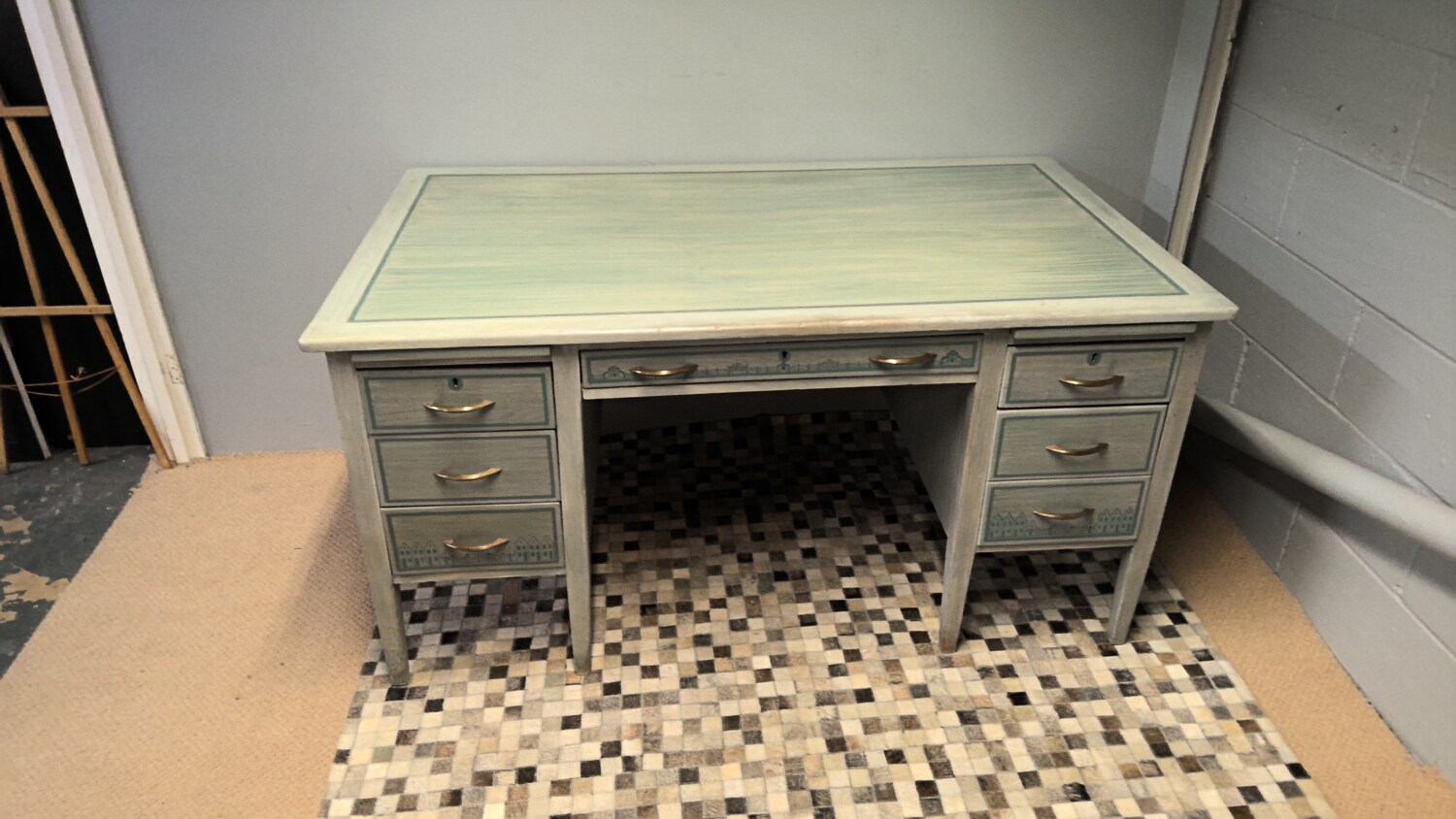Large Solid Wood Desk That Has Been Upcycled And Finished In Baby Blue With 7 Drawers