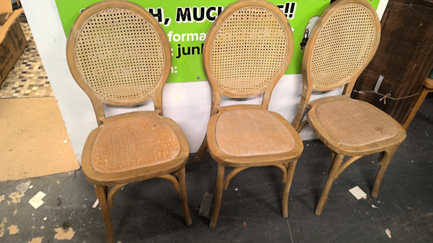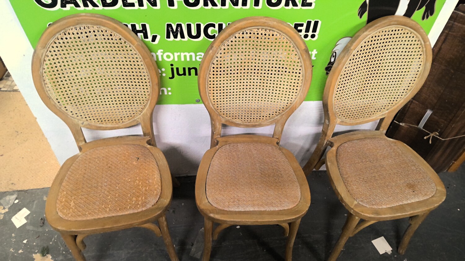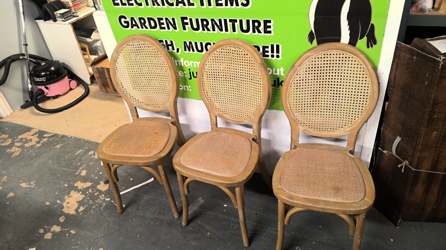set of 3 natural finish rattan / cane back dining chairs x display item a lovely set of chairs that are 43cm / long 92cm high / 43cm wide / the seat depth is 42cm / seat height is 47cm / seat length is 42cm /