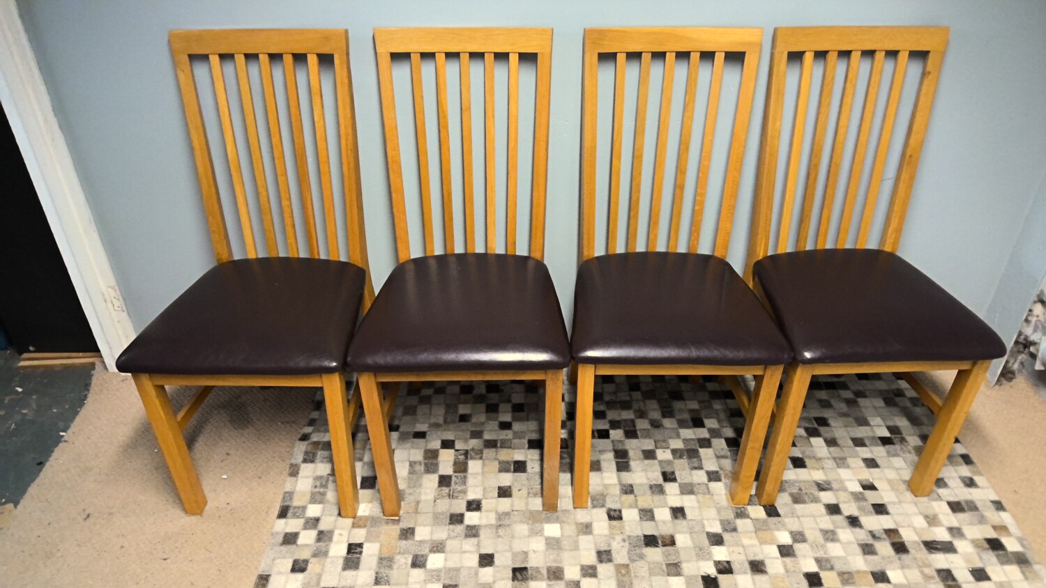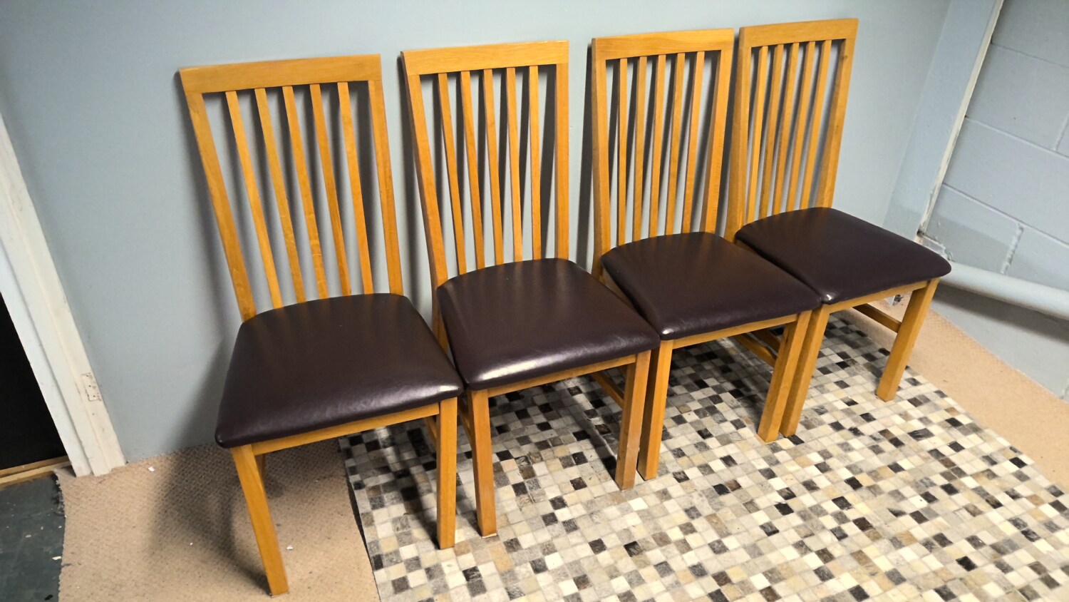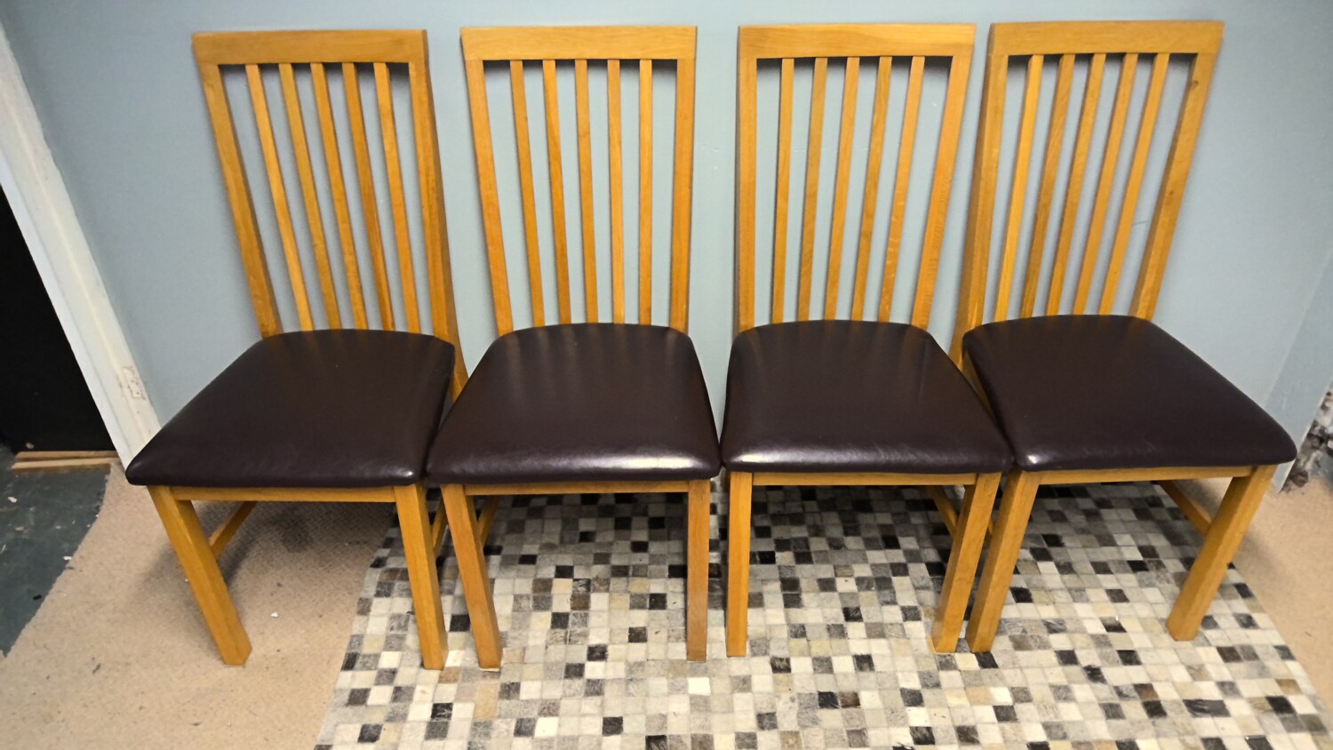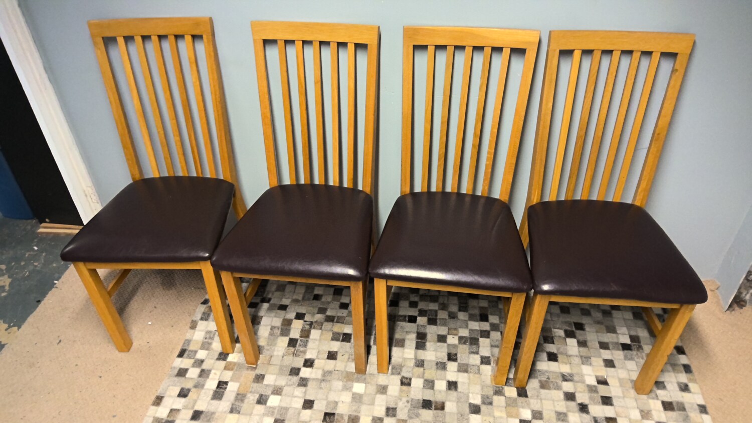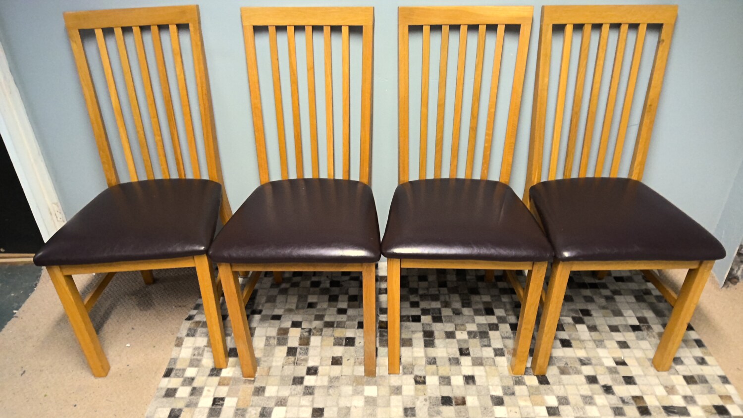 Set of 4 oak chairs with brown leather effect seat pads all in good condition