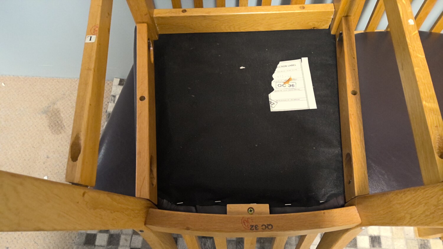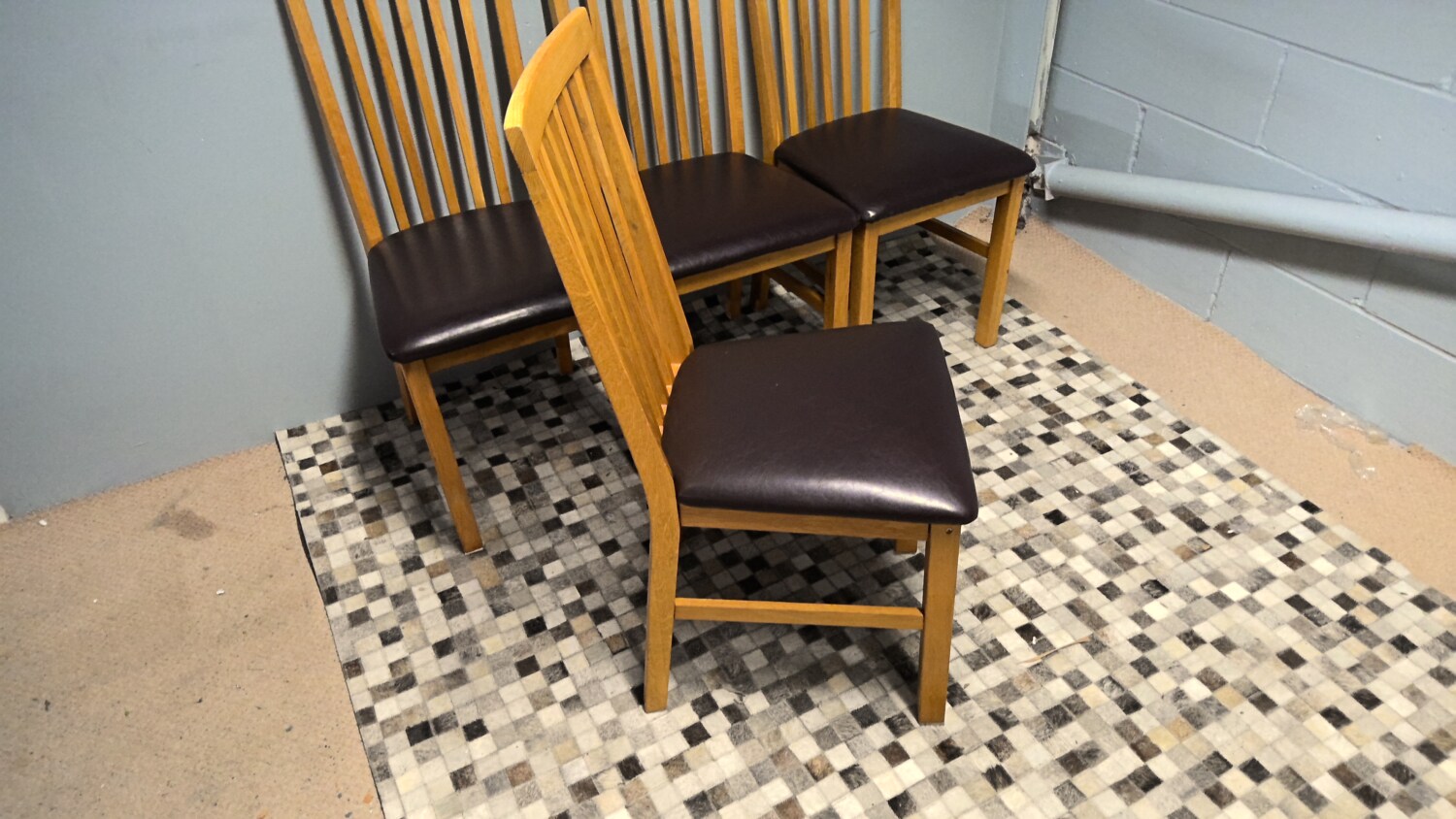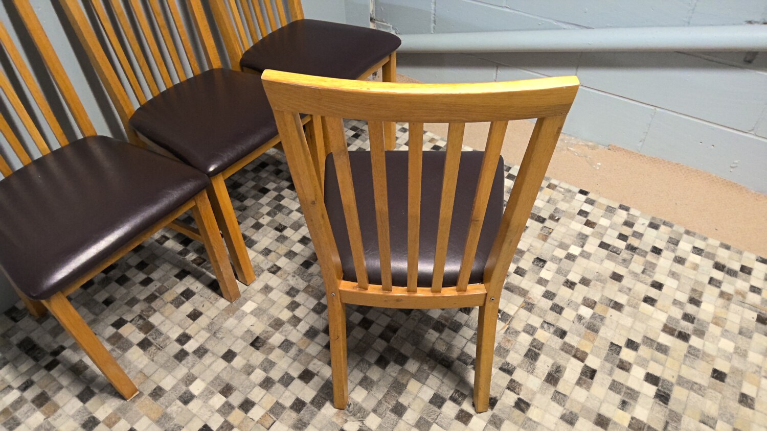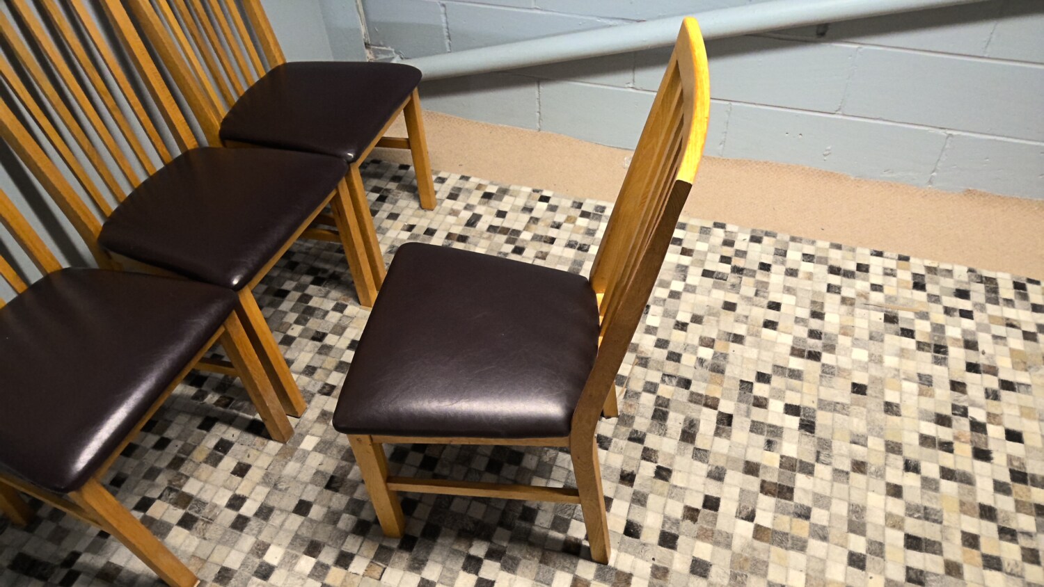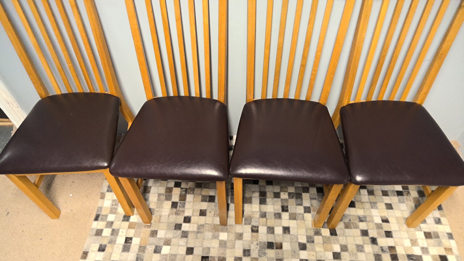 Set of 4 oak chairs with brown leather effect seat pads all in good condition