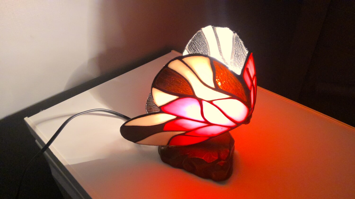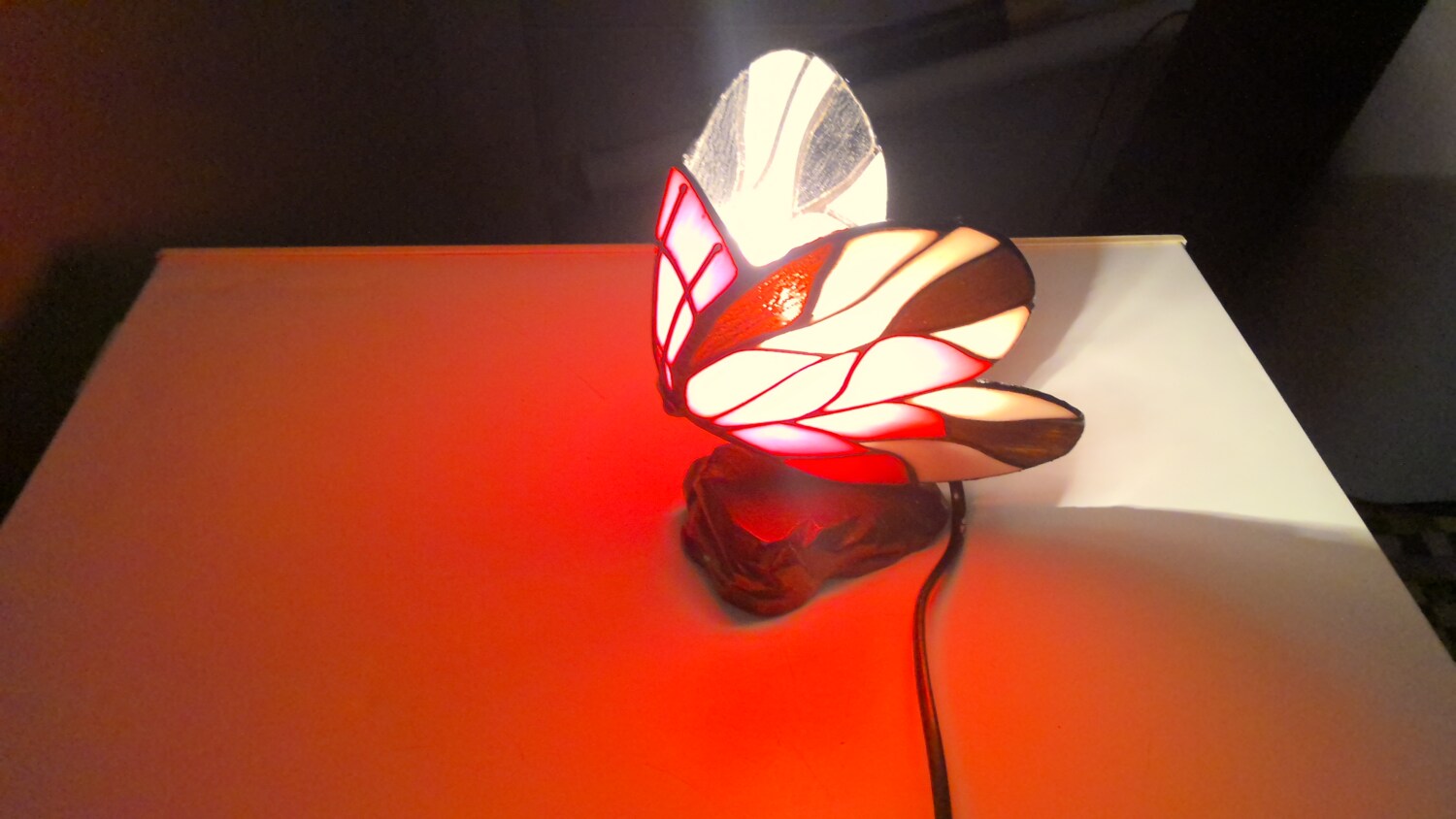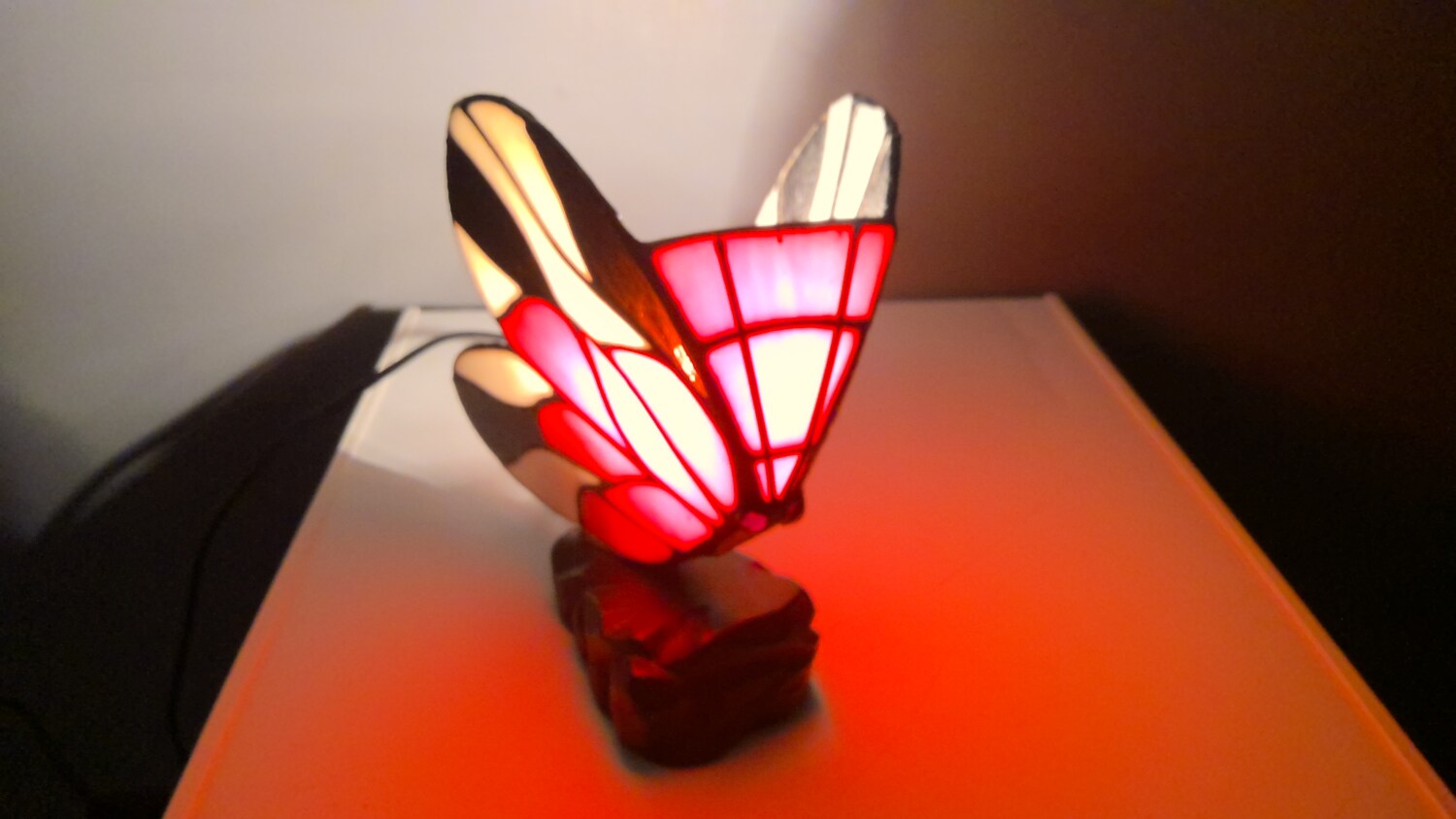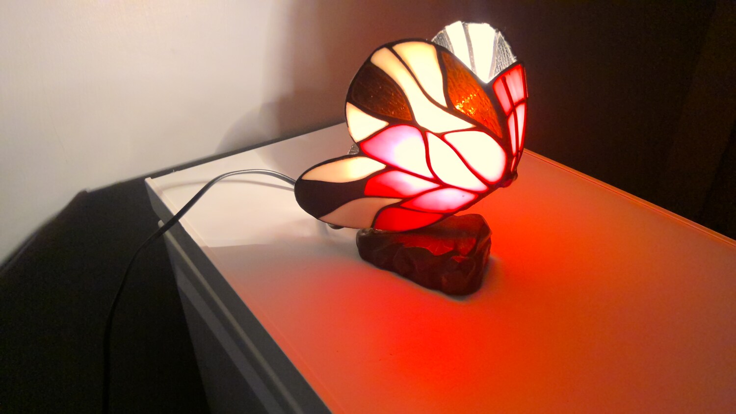 The Tiffany style butterfly lamp is a beautiful table lamp that emits a red and white in colour when light , making it perfect for adding a touch of elegance to any room. The multicoloured design of the lamp adds a whimsical touch, while the black cord colour provides a modern contrast. The lamp is powered by a corded electric source, making it easy to use and providing a soft illumination for a cozy atmosphere. Ideal for collectors or those looking to add a unique piece to their home decor.