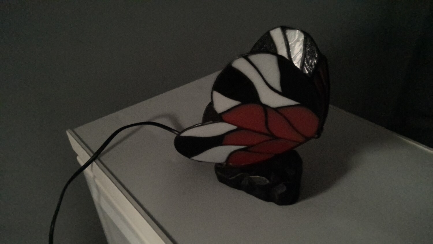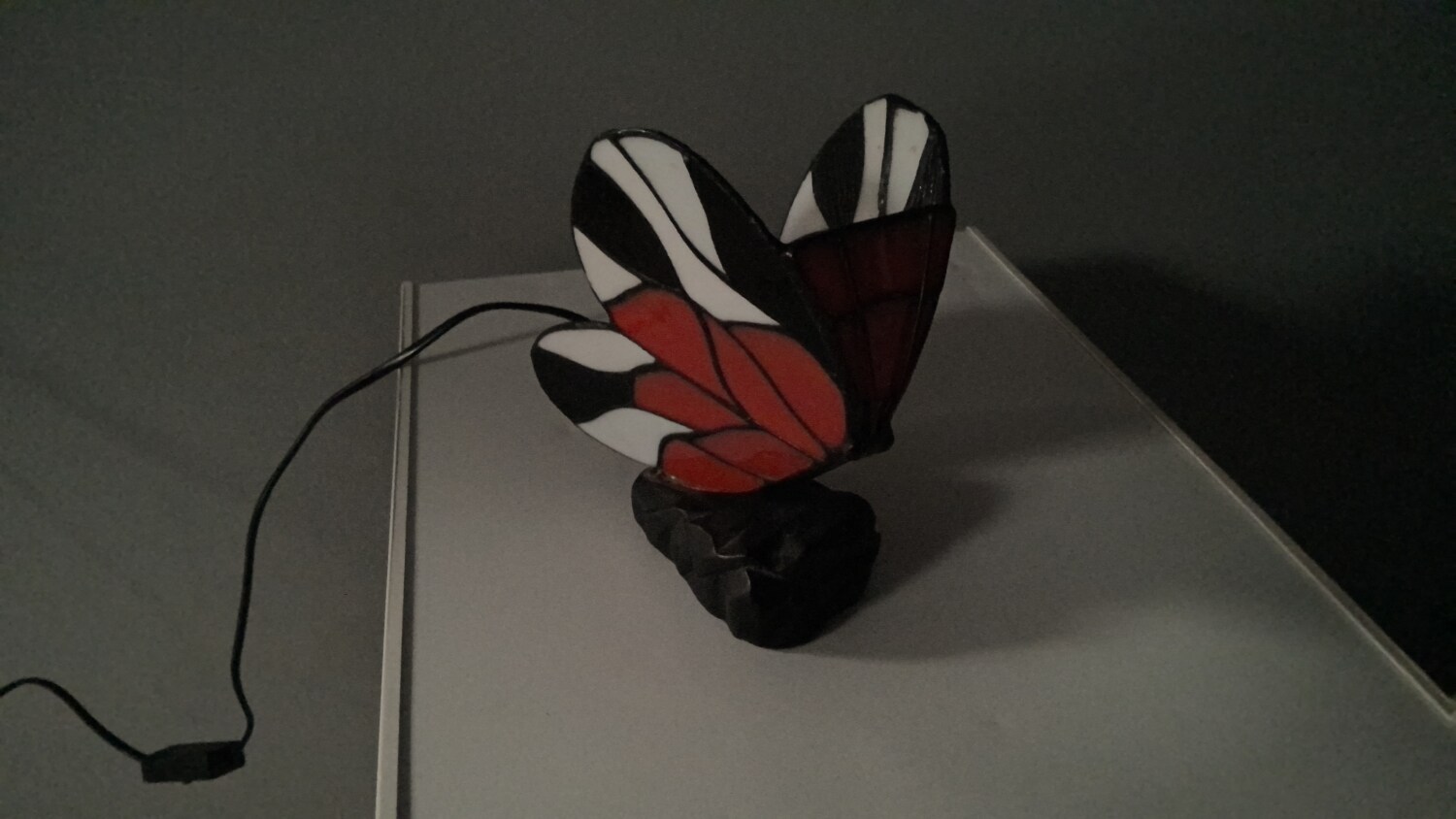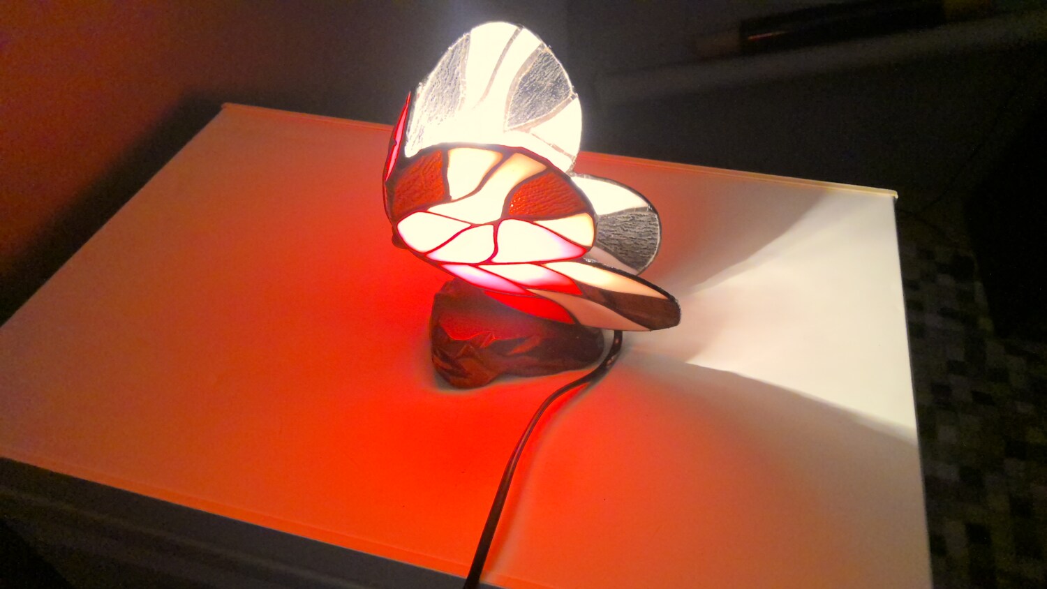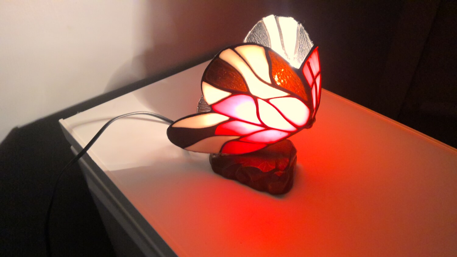 The Tiffany style butterfly lamp is a beautiful table lamp that emits a red and white in colour when light , making it perfect for adding a touch of elegance to any room. The multicoloured design of the lamp adds a whimsical touch, while the black cord colour provides a modern contrast. The lamp is powered by a corded electric source, making it easy to use and providing a soft illumination for a cozy atmosphere. Ideal for collectors or those looking to add a unique piece to their home decor.