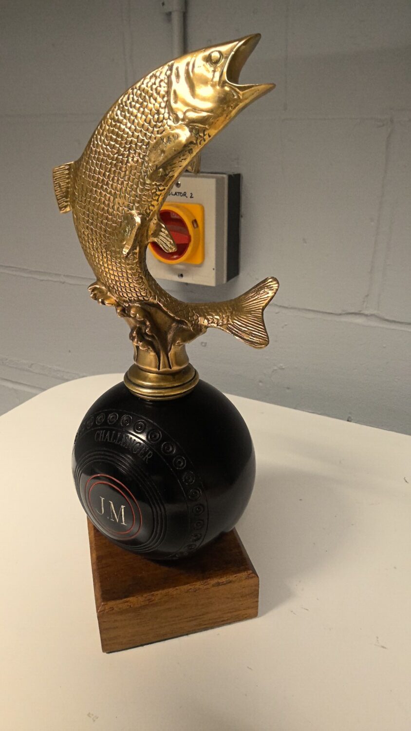 vintage bowling ball fish trophy, specially made, a one of a kind, not something you can go and buy from a shop