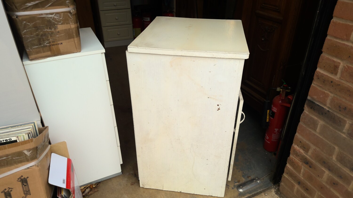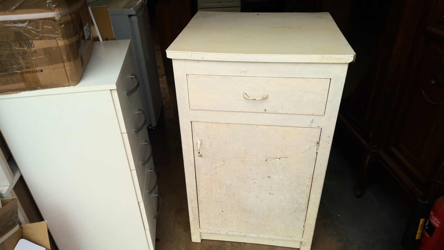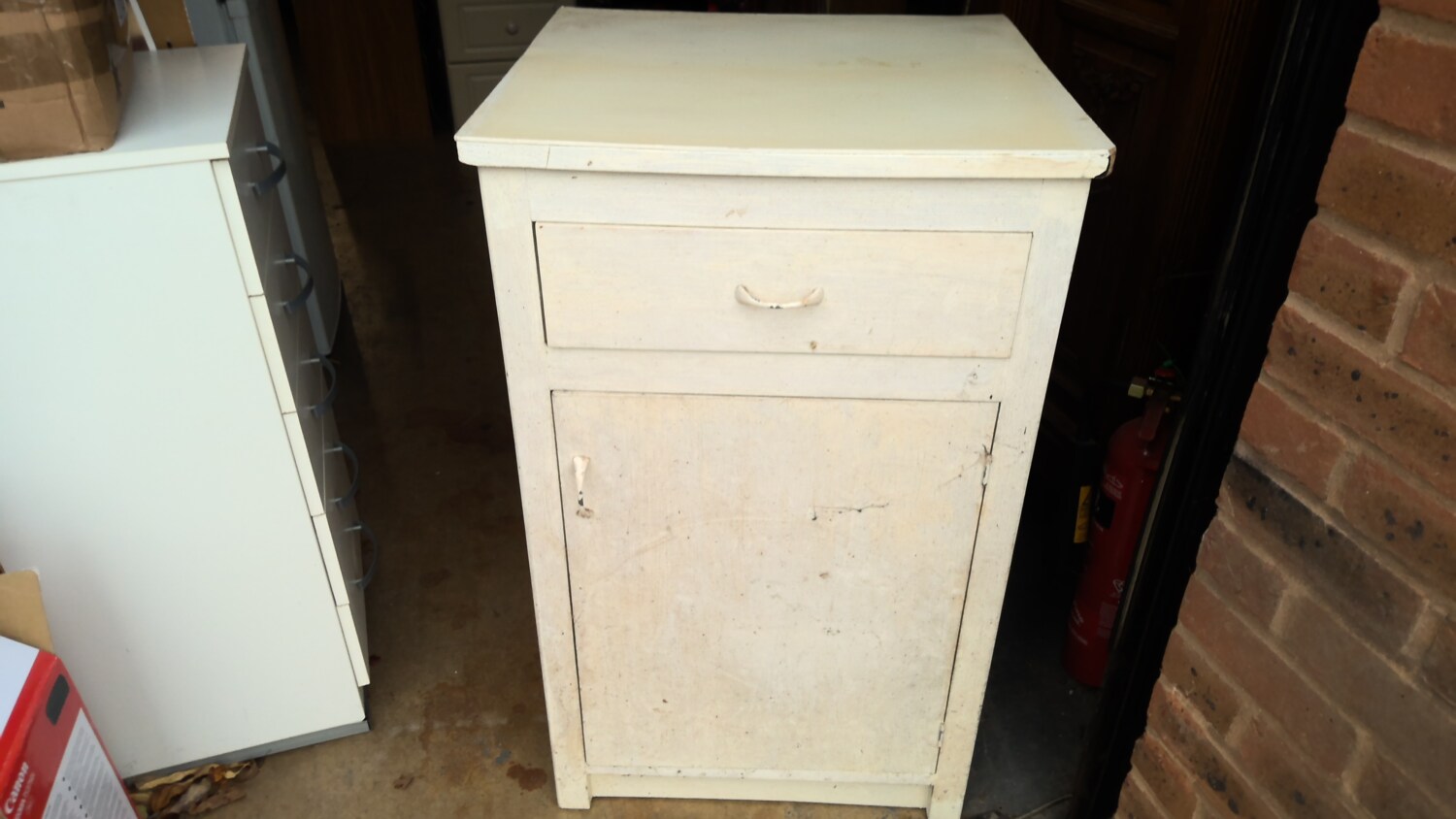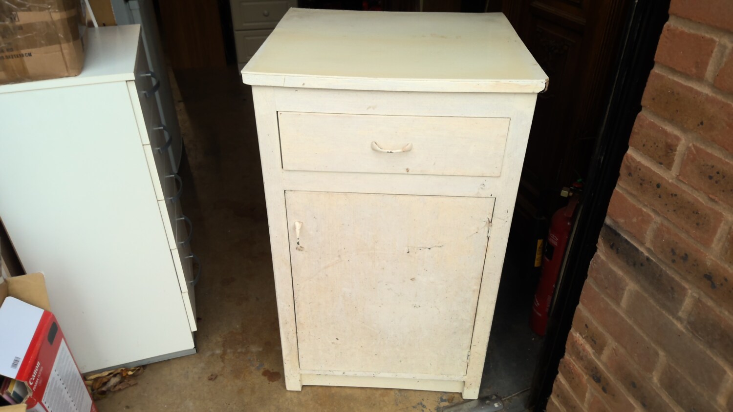 vintage cupboard with draw and storage below finished in white ideal for a garage or shed for storage