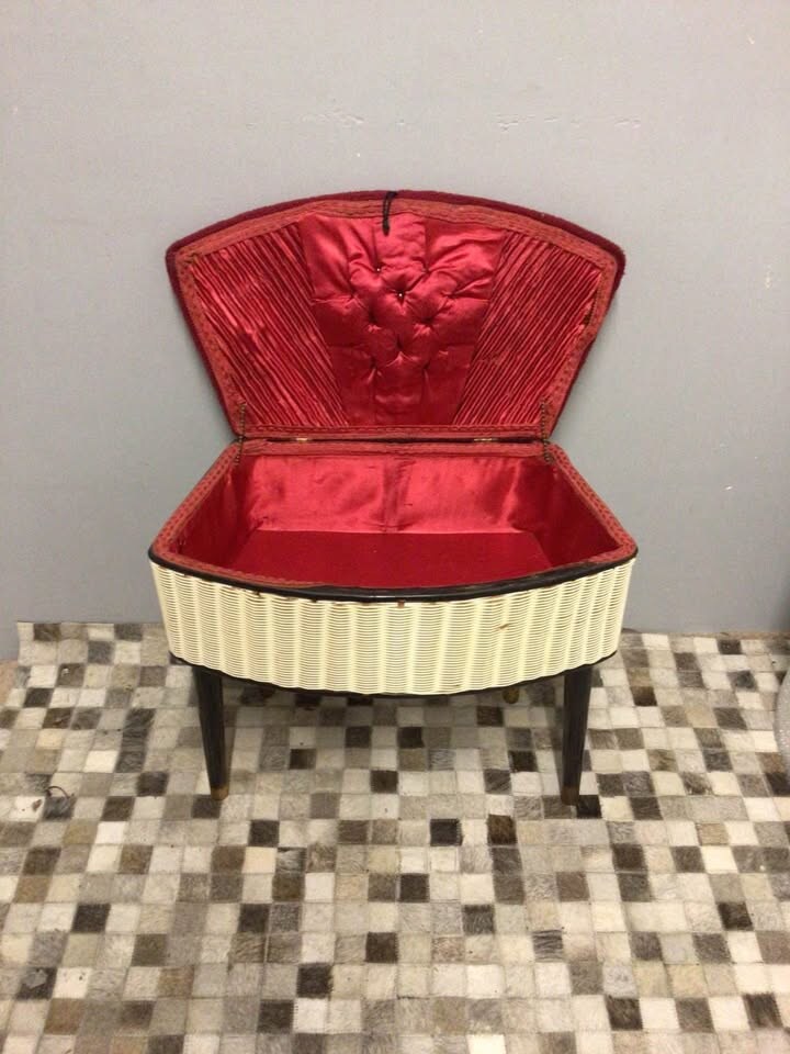vintage mid century 1950s-1960s wicker sewing box on legs ,often referred as a sewing table or basket,this is a piece of mid century n furniture,the hinged top opens to reveal storage for sewing items,this is made of wicker with a red fabric covered top and wooden legs a great mid century item to have ,this measures length 50 cm / width is 28 cm and height is 45 cm .