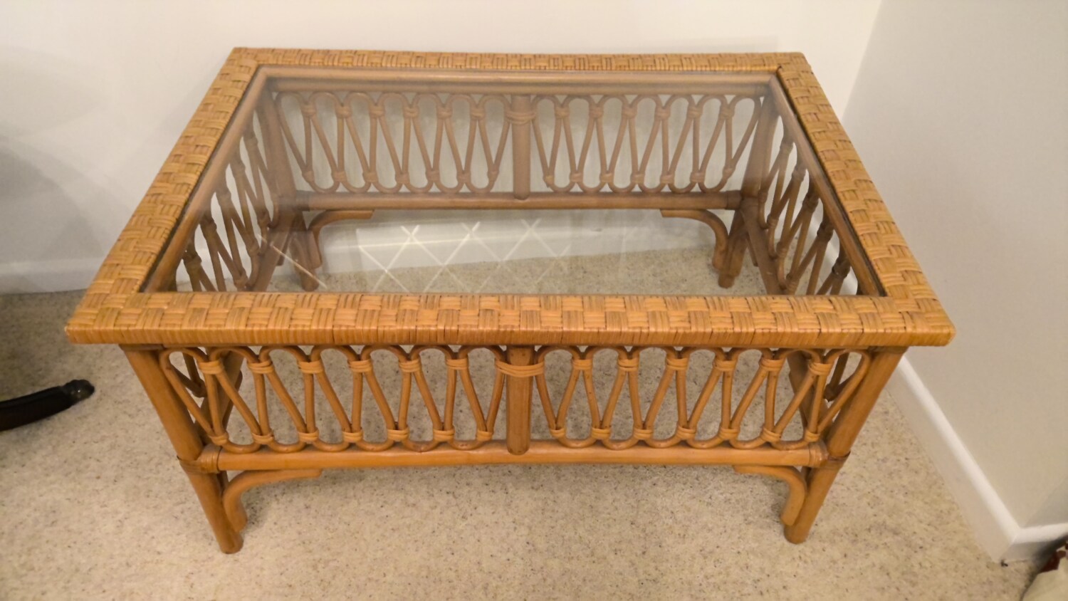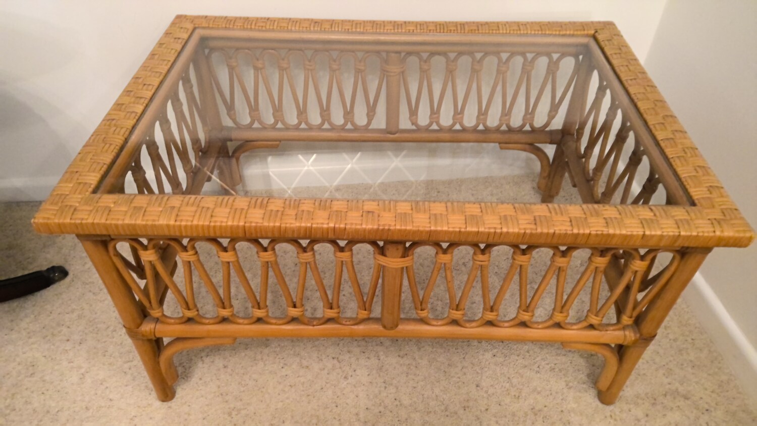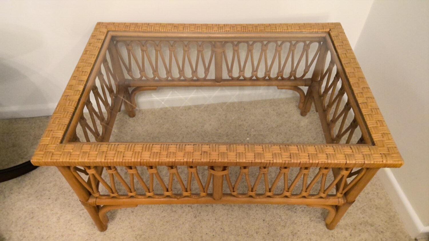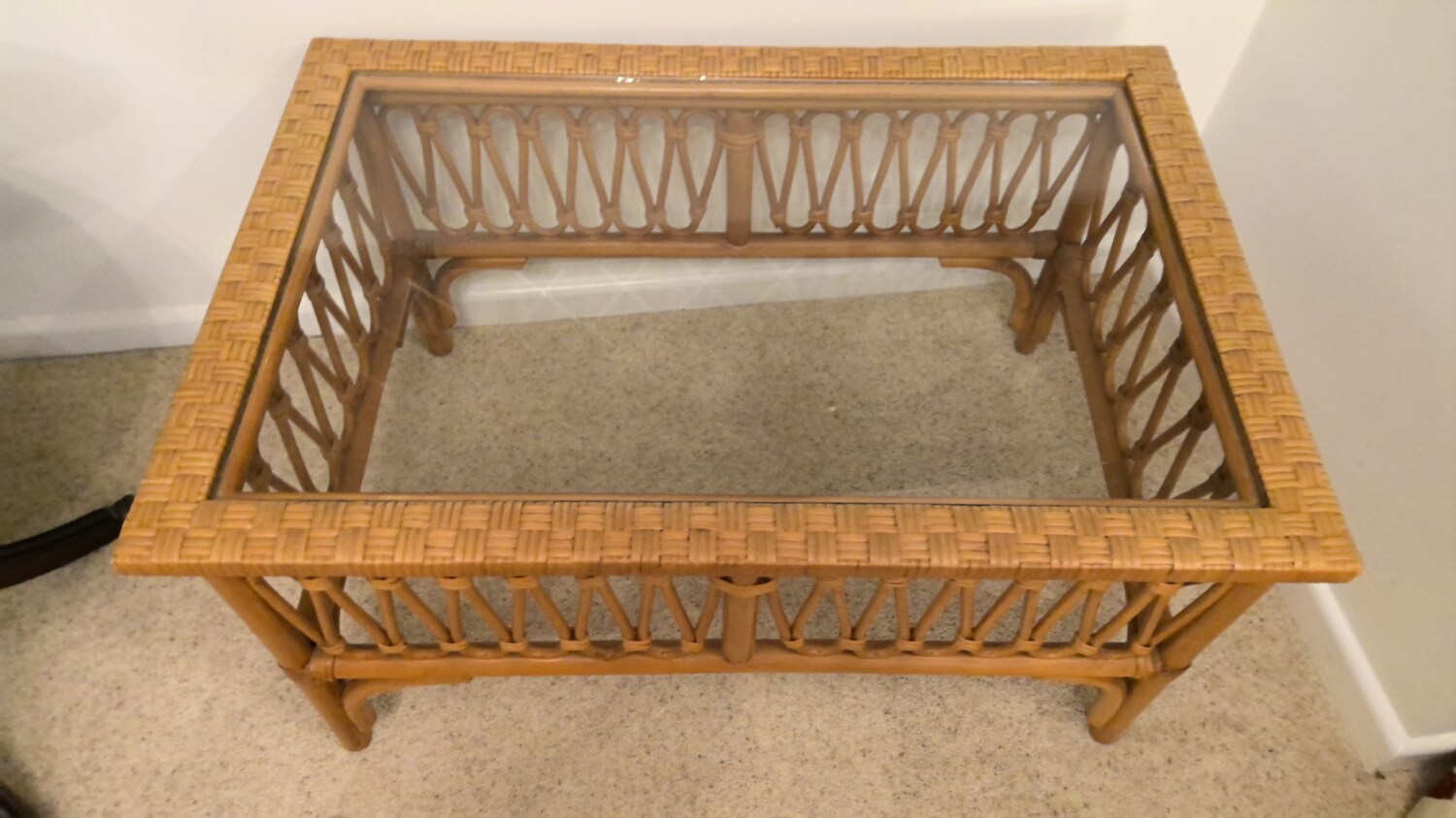 wicker coffee table with glass top in a good used condition this coffee table is 81cm long / depth 55cm / height 44cm